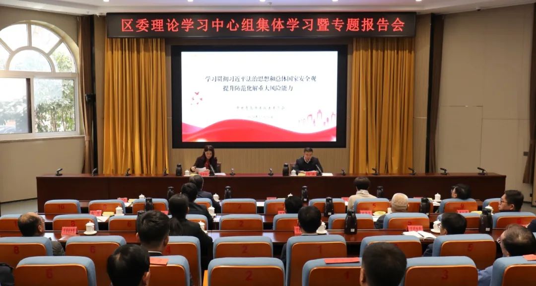 12月26日上午,青岛市城阳区委理论学习中心组(扩大)集体学习会在区人民会堂举行,市委、政法委副书记白雪青参加集体学习,并作“学习贯彻习近平法治思想和总体国家安全观、提升防范化解重大风险能力”专题宣讲。区委书记吕鹏主持会议。