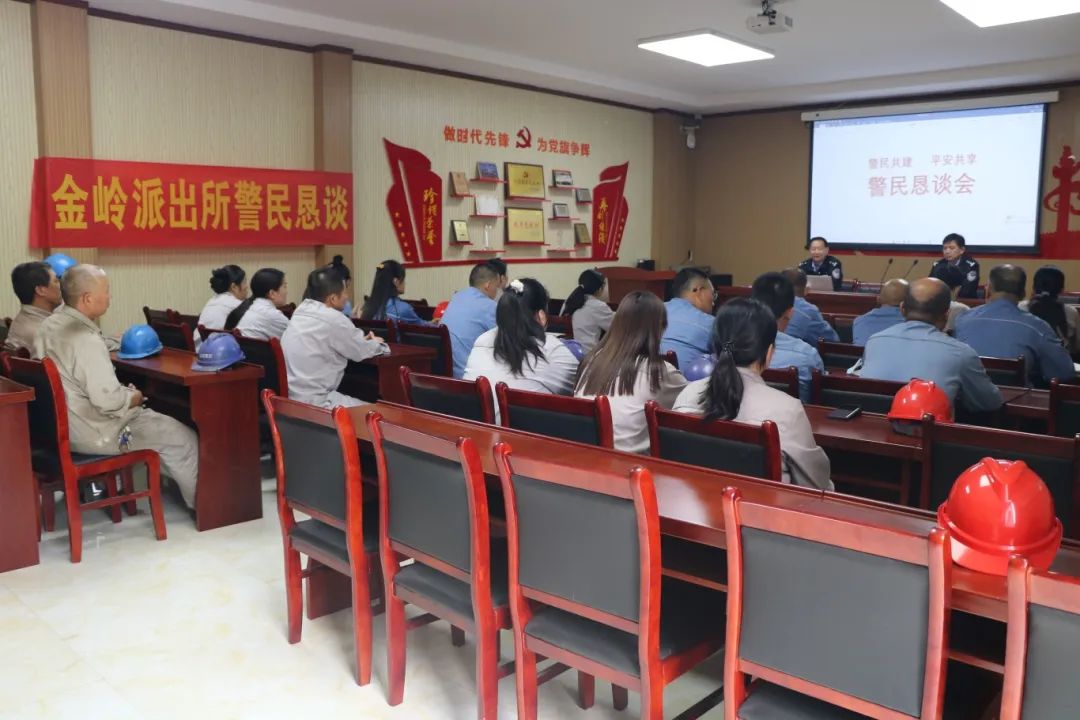 在金岭派出所辖区,民警走进企业,针对常见的电诈手段,向企业职工讲解新型电信网络诈骗相关知识以及防范措施,并听取意见建议。