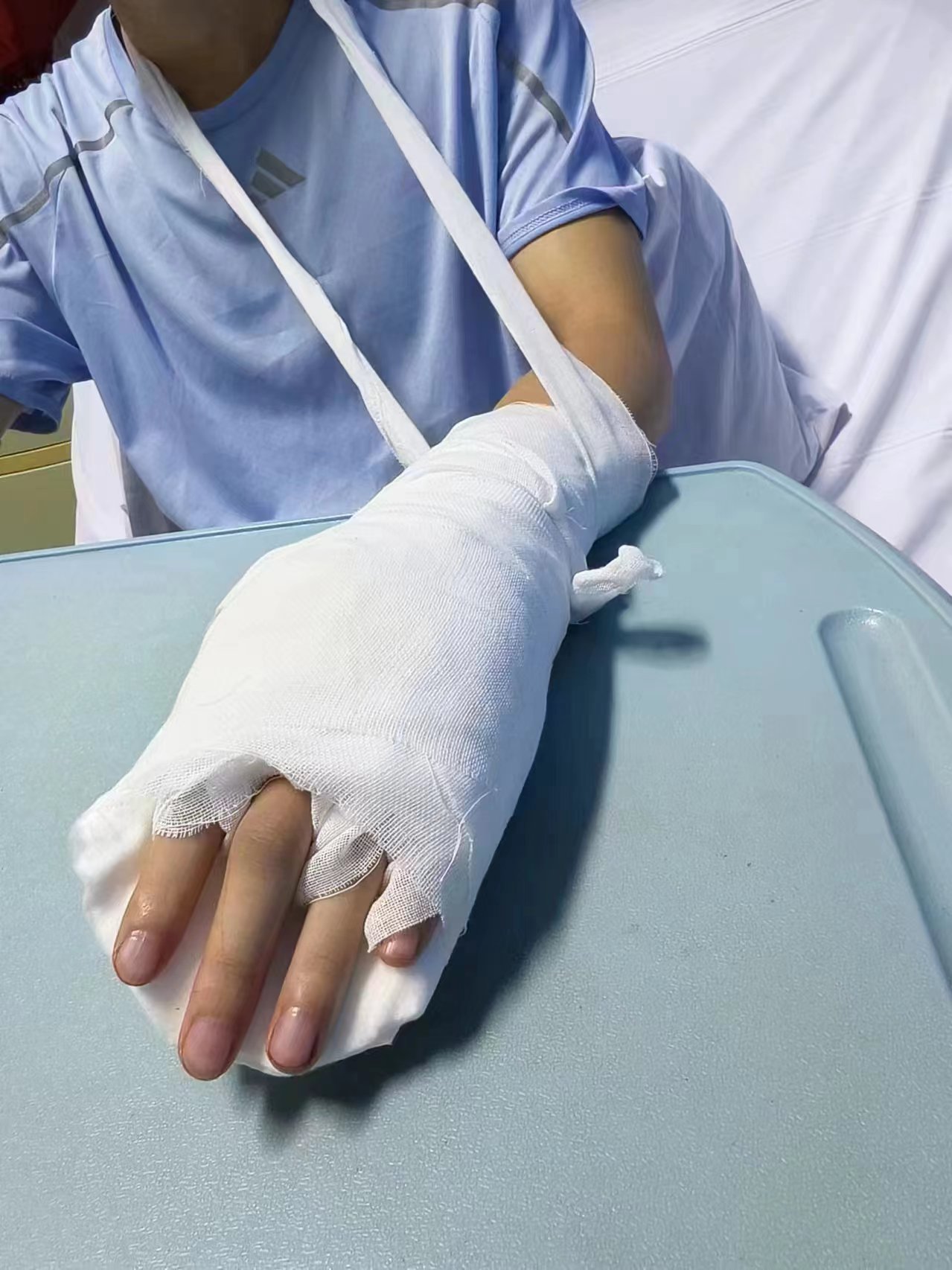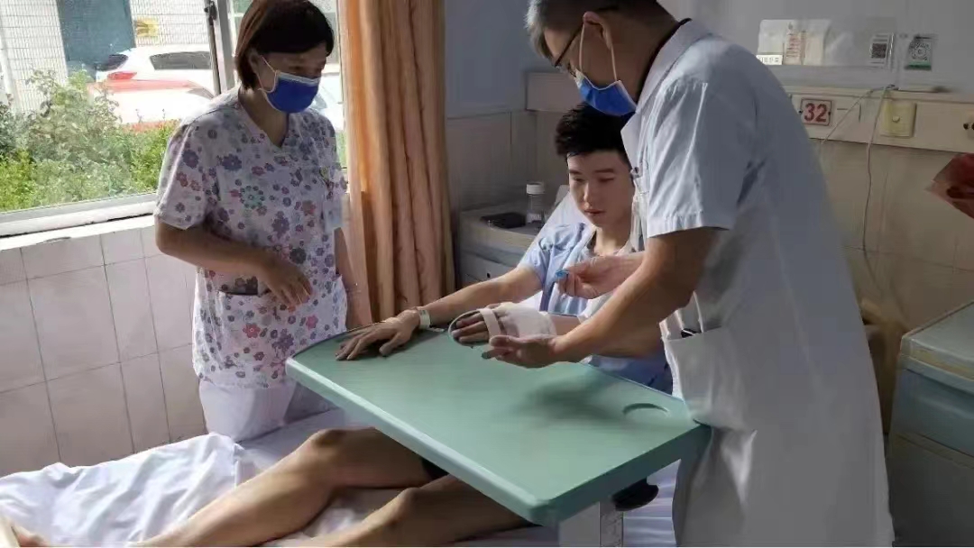 救护车到达后,周治山先让受伤人员上救护车,现场处置完毕后,周治山才让同事将他送往医院救治。经诊断,周治山有左腿多处挫伤,左手手背有三处刀伤,左手中指肌腱断裂。