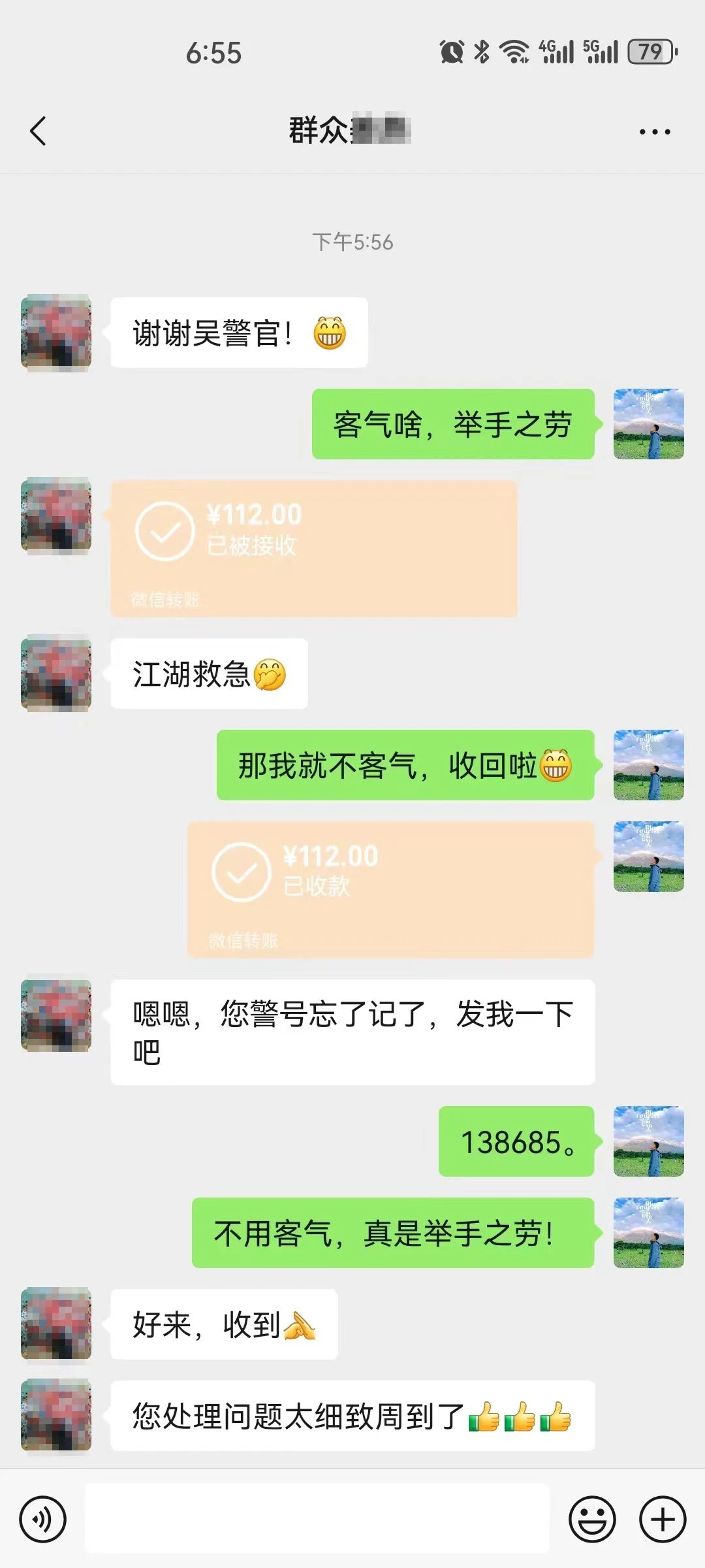 今年4月,一女子来到警务站寻求帮助:其手机落在了同事车上,一时间身无分文,又因不记得同事号码无法联系,焦急万分。得知情况后,吴超赶忙拨打该女子电话,却一直处于无人接听状态。无奈,又另寻他法,终于与同事取得联系,约定好见面地点取回手机。而当时恰逢警务站勤务较多,无可出警车辆,吴超便掏出112元现金借给女子赶路,最终该女子顺利与同事见面,取回了自己的手机。