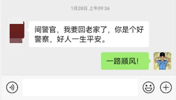 老曹文化程度不高,平时多用电话与人联络。临行前,他特意在微信上用文字再次表达谢意:“间警官,我要回老家了,你是个好警察,好人一生平安。”尽管写错了姓氏,但对简齐恒而言,这份认可弥足珍贵。