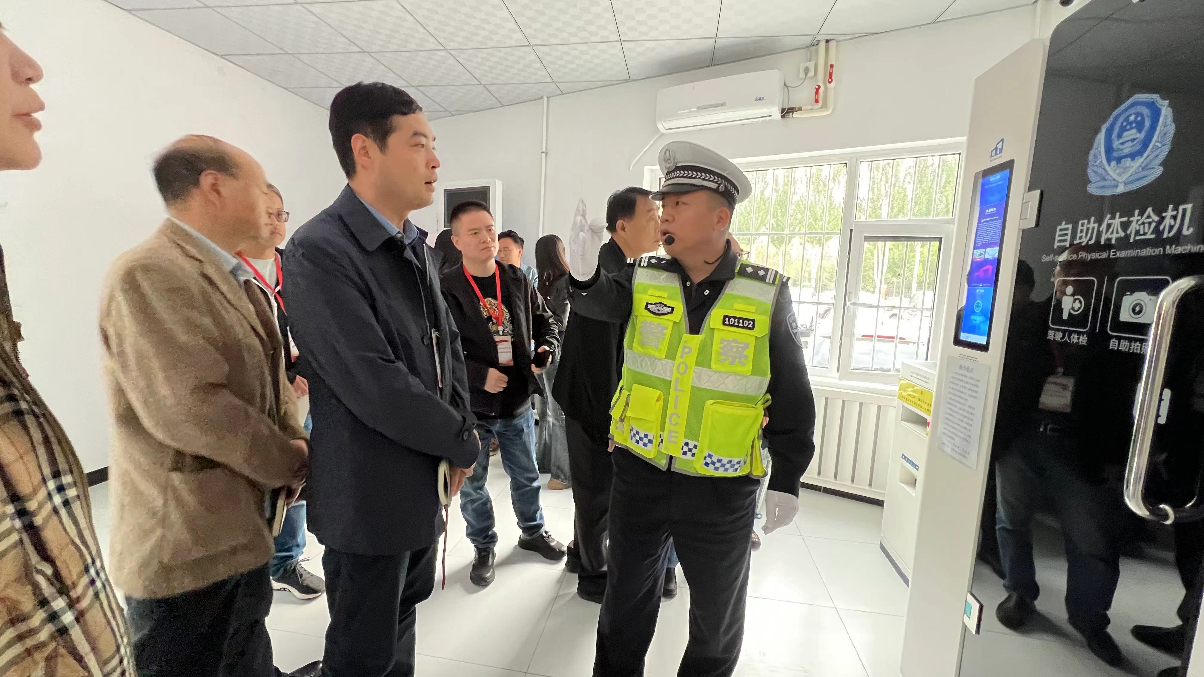 民警王辉向采访团记者介绍社区综治服务驿站配备的自助体检机的使用方法。