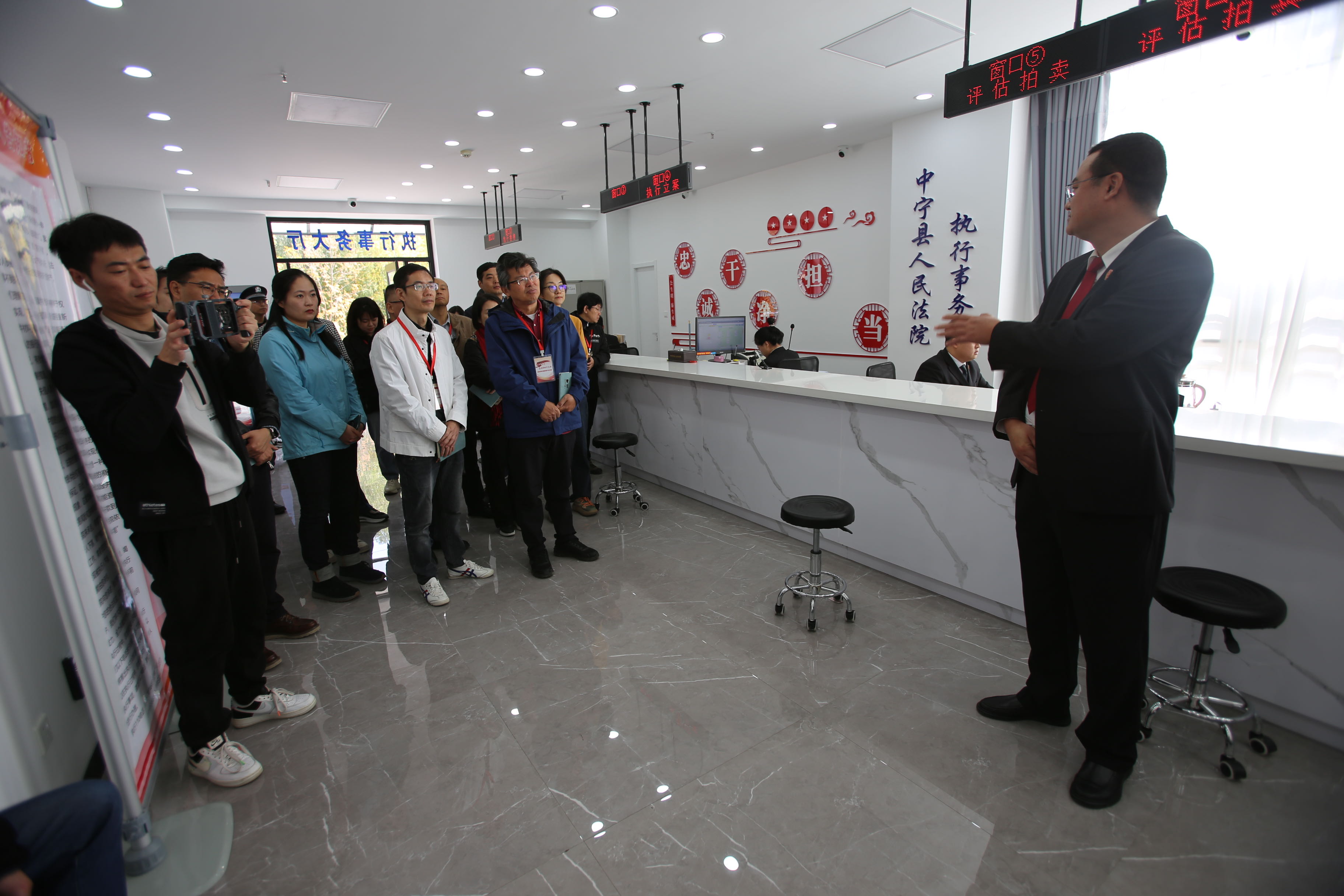 中宁县法院执行局局长马卫谦向采访团介绍执行事务工作。