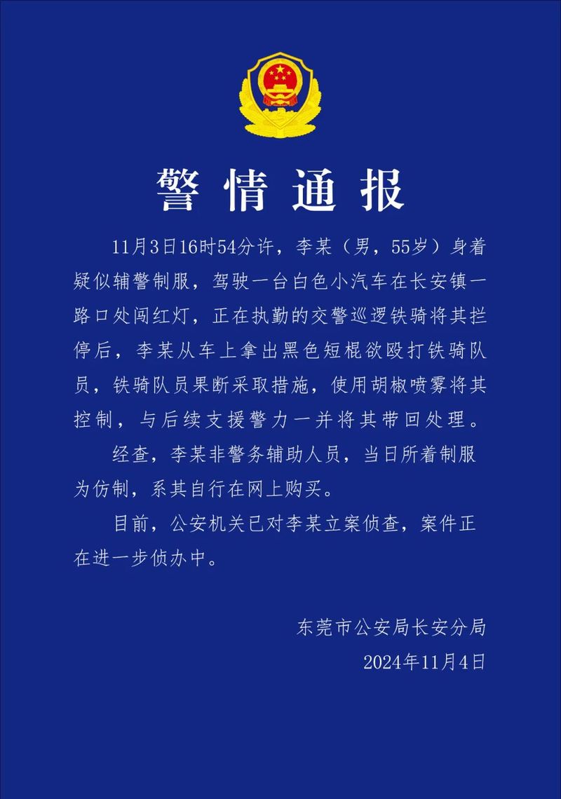 近日,东莞一男子身穿仿制辅警制服驾车闯红灯后欲殴打交警,11月4日,东莞市公安局长安分局发布警情通报,详情如下: