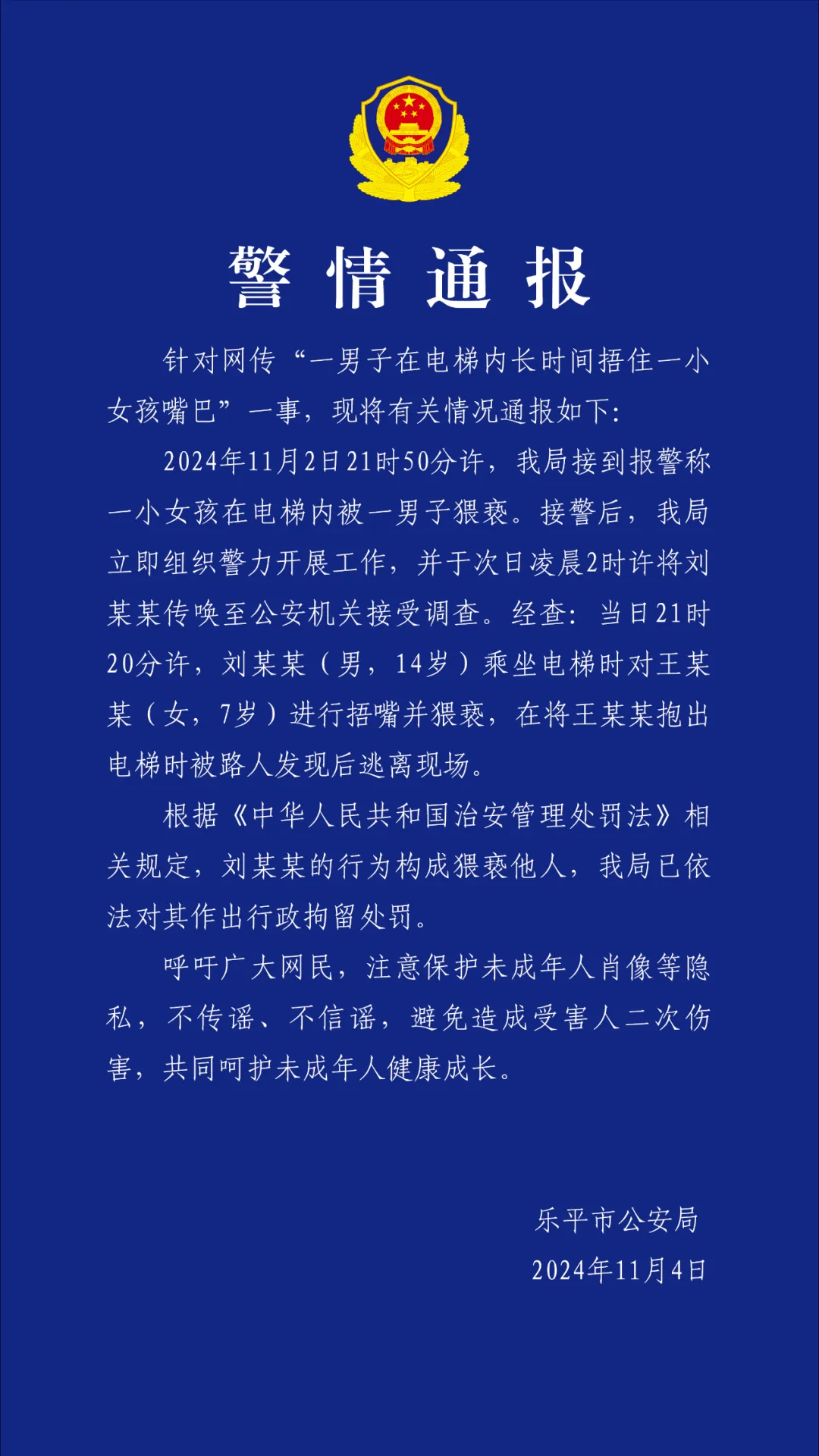 11月4日下午,乐平市公安局发布“警情通报”称,14岁男孩刘某某对7岁女童王某某捂嘴并猥亵,警方已经对其作出行政拘留处罚。