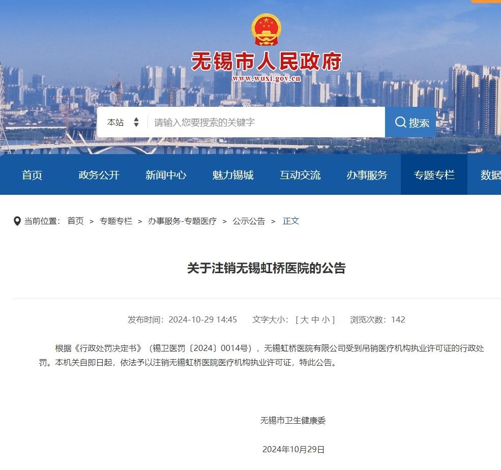 据无锡市人民政府网站消息,根据《行政处罚决定书》(锡卫医罚〔2024〕0014号),无锡虹桥医院有限公司受到吊销医疗机构执业许可证的行政处罚。本机关自即日起,依法予以注销无锡虹桥医院医疗机构执业许可证,特此公告。