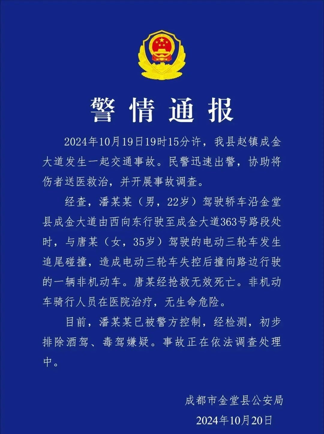 10月20日,四川省成都市金堂县公安局发布警情通报称:10月19日19时15分许,金堂县赵镇成金大道发生一起交通事故。民警迅速出警,协助将伤者送医救治,并开展事故调查。