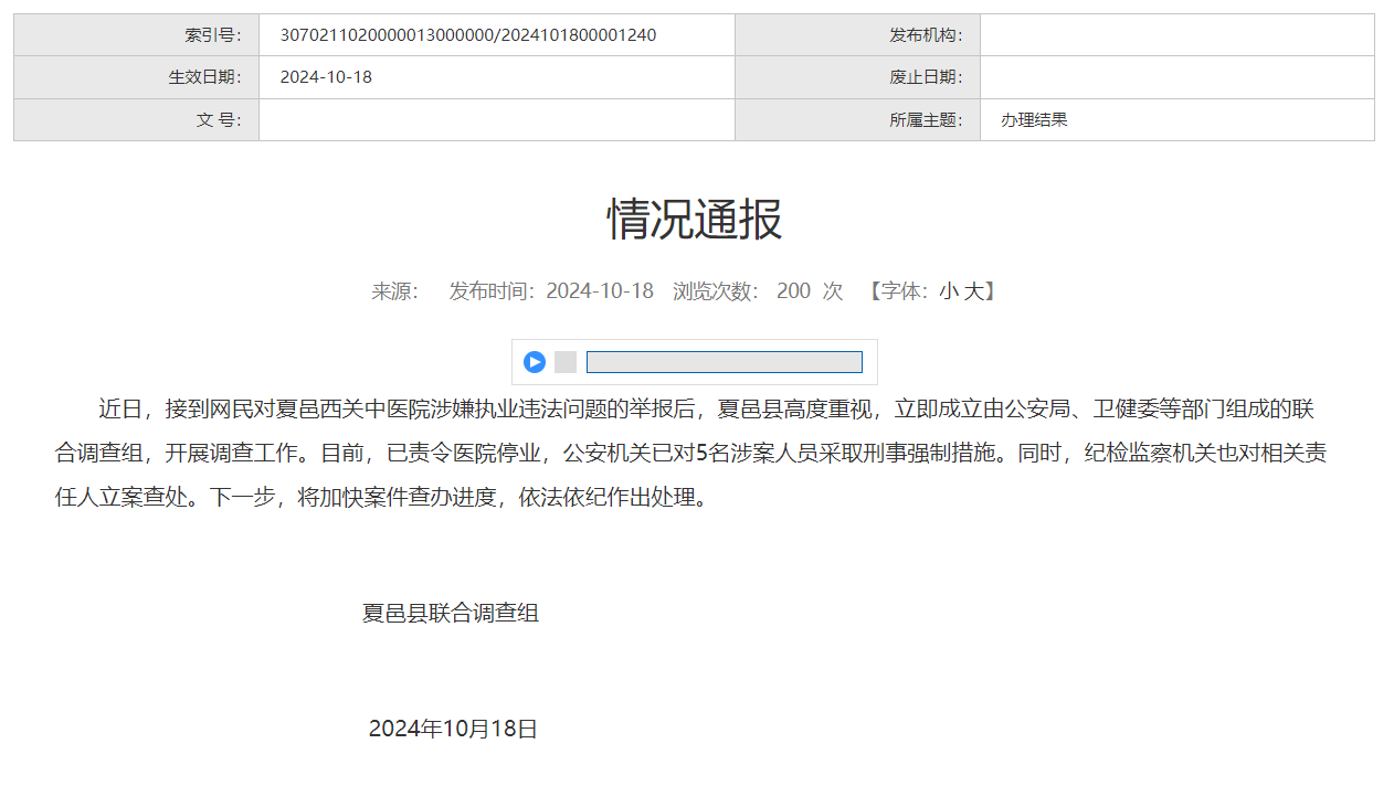 近日,接到网民对夏邑西关中医院涉嫌执业违法问题的举报后,夏邑县高度重视,立即成立由公安局、卫健委等部门组成的联合调查组,开展调查工作。目前,已责令医院停业,公安机关已对5名涉案人员采取刑事强制措施。同时,纪检监察机关也对相关责任人立案查处。下一步,将加快案件查办进度,依法依纪作出处理。