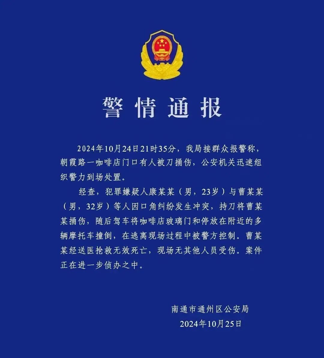 据江苏南通通州警方10月25日通报:2024年10月24日21时35分,南通市通州公安局接群众报警称,朝霞路一咖啡店门口有人被刀捅伤。