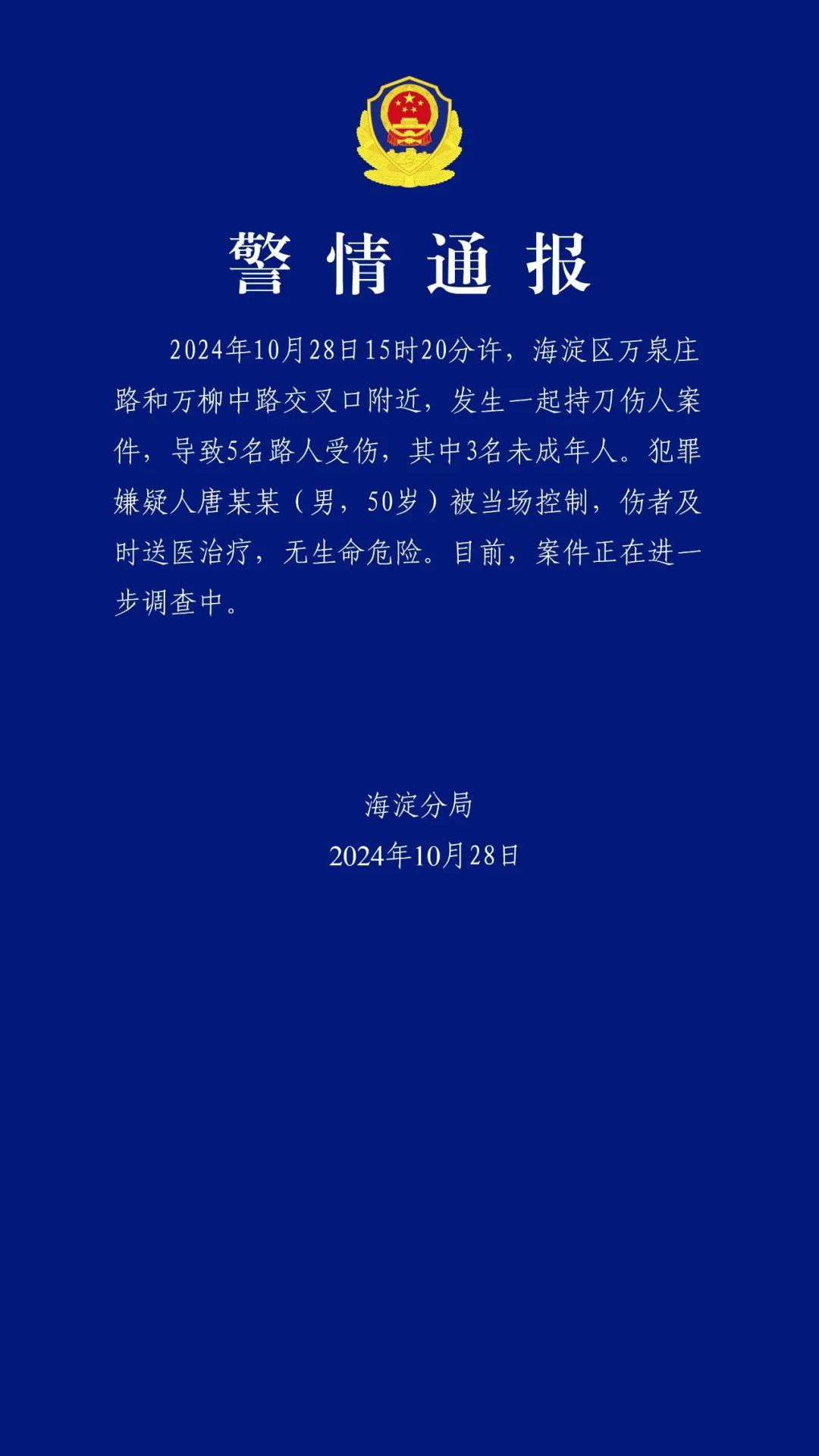 10月28日15时20分许,海淀区万泉庄路和万柳中路交叉口附近,发生一起持刀伤人案件,导致5名路人受伤,其中3名未成年人。