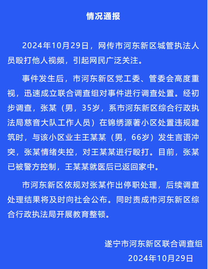 事件发生后,市河东新区党工委、管委会高度重视,迅速成立联合调查组对事件进行调查处置。经初步调查,张某(男,35岁,系市河东新区综合行政执法局慈音大队工作人员)在锦绣源著小区处置违规建筑时,与该小区业主王某某(男,66岁)发生言语冲突,张某情绪失控,对王某某进行殴打。目前,张某已被警方控制,王某某就医后已返回家中。