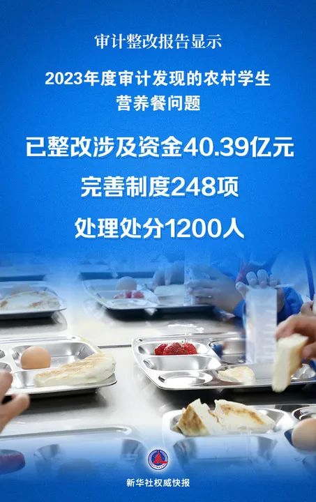 针对今年6月发布的审计工作报告中,社会比较关心的农村学生营养餐问题,12月22日出炉的审计整改报告显示,截至2024年9月底,农村义务教育学生营养改善计划专项资金审计方面已整改问题涉及资金40.39亿元,完善制度248项,处理处分1200人。
