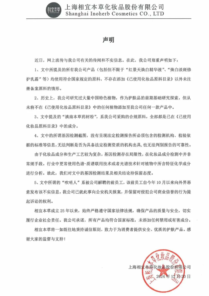 12月20晚,相宜本草在微信公众号上发布声明称,这一消息不实。
