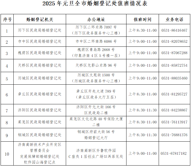 为进一步优化婚姻登记服务,满足群众多样化、个性化办事需求,不断提升便民服务质效,济南10家婚姻登记处2025年元旦当天开展结婚预约登记服务,现公告如下: