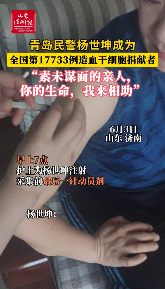 6月3日,山东济南,青岛民警杨世坤完成造血干细胞采集,成为全国第17733例造血干细胞捐献者,“素未谋面的亲人,你的生命,我来相助”...