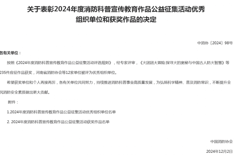 山东消防选送的作品在2024年度优秀消防科普宣传教育作品公益征集活动中获得4个一等奖、6个二等奖、7个三等奖。获奖作品涵盖绘画、视频等类......