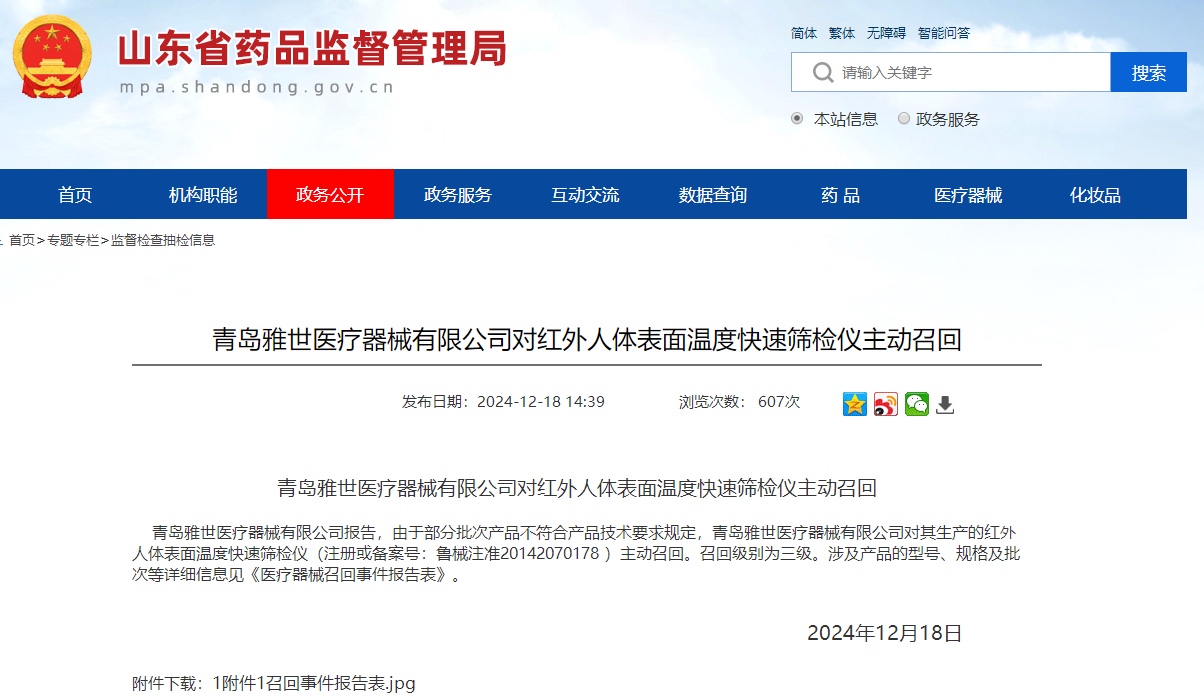 青岛雅世医疗器械有限公司主动召回红外人体表面温度快速筛检仪,因部分批次产品不符合产品技术要求规定,共500台,召回级别为三级...